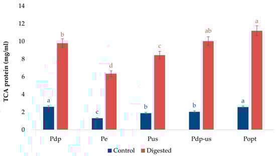 Pop and Pdp-us exhibited the highest TCA-protein content after digestion, which indicated their highest digestibility among all protein isolates. This enhanced digestibility probably resulted from structural changes in the protein caused by ultrasound and the removal of phenolic compounds, which increased protein accessibility and facilitated more efficient enzymatic hydrolysis. Pdp also showed high digestibility, while the sample treated only with ultrasound (Pus) had slightly lower TCA-soluble protein content in comparison with other samples. The moderate digestibility of Pe may be attributed to the retention of larger molecular weight protein fractions that require extended hydrolysis and different proteolysis conditions.