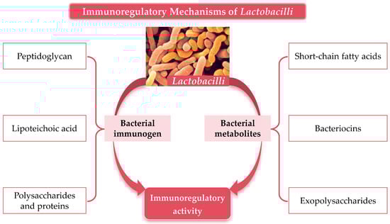 As an important group of probiotics, Lactobacilli mediate the immunomodulatory mechanisms primarily through two major pathways: their own components (immunogenic substances) and metabolites, as shown in Figure 1.