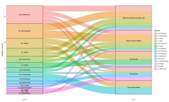 Frequency distribution of lactic acid bacteria species isolated from animal-based (wild fermented mountain milk and natural whey starter) and plant-based (sourdough, kombucha, and fermented millet) matrices. The plot illustrates the occurrence of 15 distinct lactic acid bacteria species across the five fermentation sources. The size of each box representing bacterial species is proportional to the number of isolates corresponding to that species, while the boxes denoting the sources of isolation are scaled to reflect the relative abundance of each source. The frequency of bacterial species across the different matrices highlights the variability in microbial diversity associated with plant-based and animal-based fermentation environments.