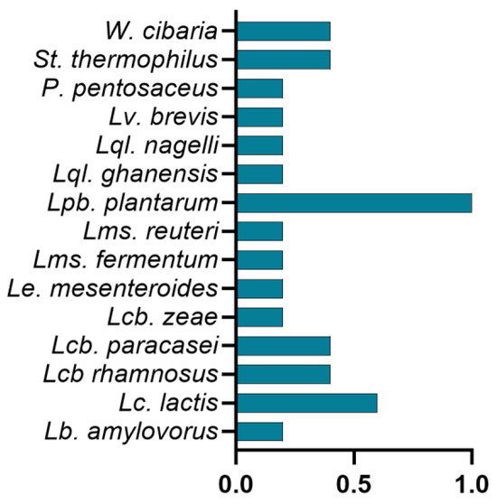 To assess species’ richness and evenness, we calculated diversity indices for the entire dataset and for individual matrices. The Shannon Diversity Index (H′) for all isolates was 2.47, reflecting moderate-to-high species richness. The Simpson’s Diversity Index (D) was 0.89, suggesting that no single species was excessively dominant but rather a balanced composition was observed across the isolates. Comparing the microbial diversity between the two sources, animal-derived samples exhibited a narrower spectrum of LAB species, predominantly associated with dairy environments, whereas plant-based samples harbored a more heterogeneous LAB community. This aligns with previous research indicating that plant substrates offer a more dynamic microbial landscape due to their varied carbohydrate composition, pH conditions, and presence of secondary metabolites [46,47,48]. The observed species distribution also suggests a niche-specific adaptation of LAB, where facultative and heterofermentative species thrive in plant matrices, while fast-acidifying, homofermentative strains dominate dairy environments. Calculating Simpson’s Diversity Index (D) for each source further confirmed these trends. The plant-based LAB isolates yielded a higher diversity index (D = 0.91), reflecting the presence of multiple species with a more even distribution. In contrast, the animal-derived LAB community exhibited a slightly lower diversity index (D = 0.85), driven by the predominance of a few key species, such as St. thermophilus and Lc lactis. These findings reinforce the notion that microbial diversity in fermented foods is strongly influenced by the nature of the substrate, with plant-based fermentation fostering a more complex microbial ecosystem than dairy fermentation [49,50,51]. To quantify the ecological distribution of LAB species (343 strains belonging to 15 different species), we calculated the occurrence Index (OI), defined as the proportion of food matrices in which a given species was detected (Figure 2). Notably, Lpb. plantarum—represented by 69 strains—was the only species detected in all five food matrices (OI = 1.00), highlighting its remarkable ecological adaptability.