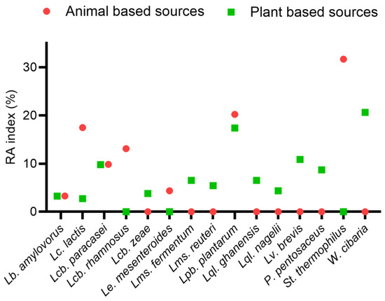 Relative abundance (RA) of 15 lactic acid bacteria species in plant-based and animal-based sources. This figure displays the relative abundance (RA) of 15 lactic acid bacteria species isolated from three plant-based matrices (fermented millet, kombucha, and sourdough) and two animal-based matrices (wild fermented mountain milk and natural whey starter). The RA illustrates the relative distribution of species, with green plots representing plant-based matrices and red plots representing animal-based matrices. Higher RA values indicate a greater prevalence of species within each matrix type, reflecting significant differences in microbial composition between plant- and animal-derived substrates.