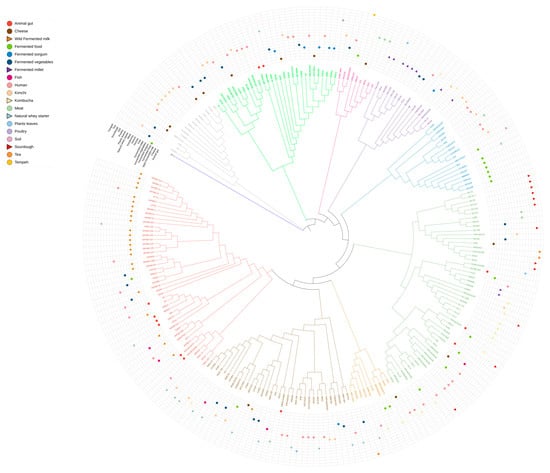 A noteworthy observation was the matrix-specific clustering of the new strains isolated and sequenced from the five fermented wild sources (Figure 5).