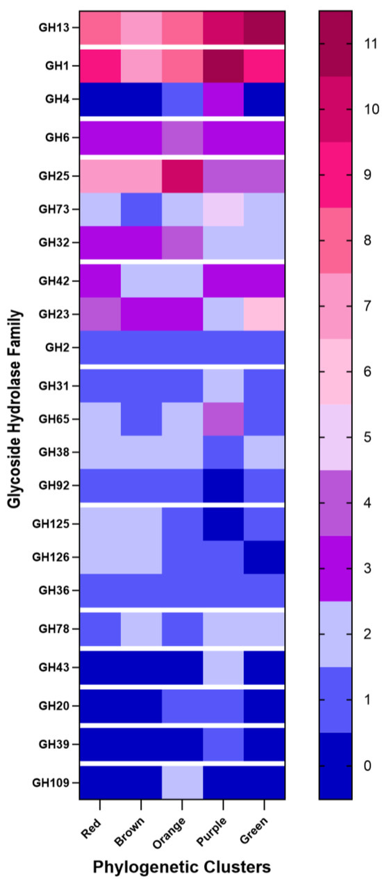 Heatmap of the glycoside hydrolase (GH) family distribution across the five Lactiplantibacillus plantarum WGS clusters. The map shows the relative presence of 22 GH families across five distinct Lactiplantibacillus plantarum WGS clusters (red, brown, orange, purple, and green). A discrete color scale is used, ranging from blue (low presence) to red (high presence), indicating the abundance of each GH family within the clusters.