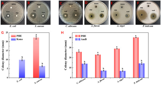 Inhibitory zone formed around the PHE against the six model strains. (A) PHE against E. coli. (B) PHE against S. aureus. (C) PHE against C. albicans. (D) PHE against A. flavus. and (E) PHE against A. niger. (F) PHE against P. italicum. (G) Comparison of antimicrobial activity of PHE against E. coli and S. aureus significantly, (a,b) non-identical letters denote statistical difference (p < 0.05). (H) Comparison of antimicrobial activity of PHE against C. albicans, A. flavus, A. niger, and P. italicum significantly, (a,b) non-identical letters denote statistical difference (p < 0.05).