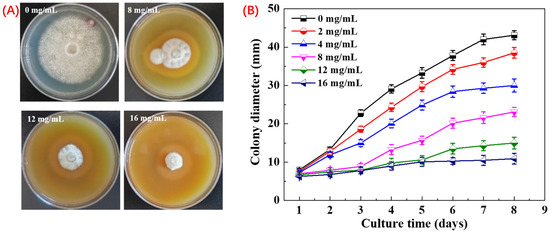 Inhibition of A. flavus by PHE at different concentrations. (A) Effects of different concentration of PHE on colony morphology at day 8. Values at different concentration differ significantly (p < 0.05), and (B) effects of different concentration of PHE on colony diameter from day 1 to day 8.