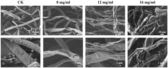 SEM images of A. flavus treated with different concentrations of PHE (Control, 8, 12, 16 mg/mL) for 24 h.
