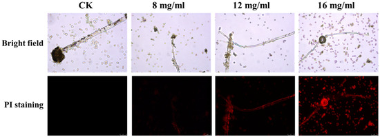 The effect of PHE on cell wall integrity was measured using the method of propidium iodide (PI) staining [27]. In brief, A. flavus was incubated for seven days prior to treatment as outlined in Section 2.5.3. The untreated mycelia were used as a control group. The untreated mycelia were used as a control group. Mycelia were dyed with 25 μg/mL propidium iodide (PI) in the dark for 30 min at 37 °C and then washed three times and resuspended in PBS. Subsequently, fluorescence was detected by fluorescence microscopy (Leica DM3000-LED, Wetzlar, Germany).