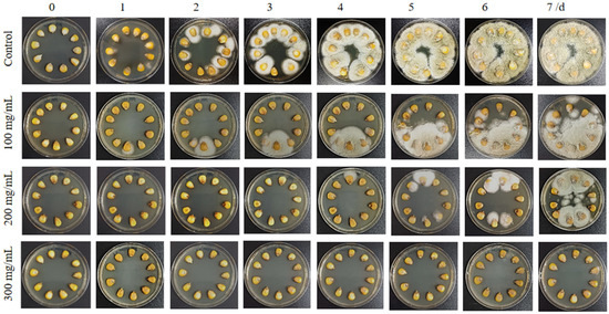 The maize samples were obtained from a local supermarket and sieved to remove impurities and randomly divided into four portions, each of 10 capsules. Before testing, the maize seeds were surface-sterilized by immersing them in a 0.05% sodium hypochlorite solution for 1 min, followed by several rinses with sterile distilled water. After drying the maize seeds in a sterile environment, each maize seed was infiltrated in the A. flavus solution of A. flavus (1 × 106 spore/mL) for 10 min to ensure that each seed was completely contaminated. Each group of maize seeds was then treated with the solutions of PHE (100, 200, 300 mg/mL) and mixed for 5 min. Each set of maize seeds was laid flat in Petri dishes with PDA medium and incubated at 30 °C for 7 days for observation. DMSO was used as control and each treatment consisted of three replicates.