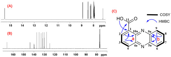 The PHE exhibited significant antifungal activity against A. flavus, demonstrating a pronounced absorption peak at a retention time of 13.6 min during HPLC analysis. The extracts underwent sequential fractionation via silica gel chromatography, yielding seven fractions. Notably, the second fraction exhibited antifungal properties against A. flavus and matched the high absorption peak at the same retention time in HPLC. Therefore, the crude fraction was purified by preparative HPLC. Finally, the pure compound, designated as PHE A, was elucidated and characterized using mass spectrometry, as well as one- and two-dimensional NMR spectroscopy. The compound of PHE A was obtained as a yellow solid. The molecular formula was determined as C13H8N2O2 on the basis of the HRESITOFMS analysis, which gave a sodium adduct ion [M + Na]+ at m/z 247.0477 (calculated for C13H8N2O2Na, 247.0483). The combined analysis of 1H (Figure S3) and 13C (Figure S4) NMR and HSQC spectral data revealed the presence of one exchangeable proton (δH 15.53) and seven aromatic methine groups (δH 7.90, 7.94, 7.96, 8.19, 8.26, 8.44, 8.89). The 13C NMR spectrum displayed resonances for one carbonyl carbon (δC 165.9), seven non-protonated sp2 carbons (δC 144.0, 143.3, 139.9, 139.8, 124.9), and seven sp2 methine carbons (δC 137.4, 135.1, 133.2, 131.7, 130.2, 130.0, 127.9). The a-ring was established by COSY correlations among H2/H3/H4, showing a doublet-triplet-doublet coupling typical for 1-, 2-, and 3-trisubstituted benzene protons, together with HMBC correlations from H2 to C10a, H3 to C1 and C4a. Further HMBC correlations from H2 to carbonyl carbon C11 and exchangeable proton 11-OH to C1 suggested that a carboxylic acid group should be attached to C1. The b-ring was assembled from COSY correlations H6/H7/H8/H9 and HMBC correlations from H6 and H8 to C9a, and H9 to C5a. Finally, the structure of PHE A was determined to be phenazine-1-carboxylic acid (PCA) (Figure 6) [38] on the basis of almost identical 13C chemical shift data, as shown in Table S1.