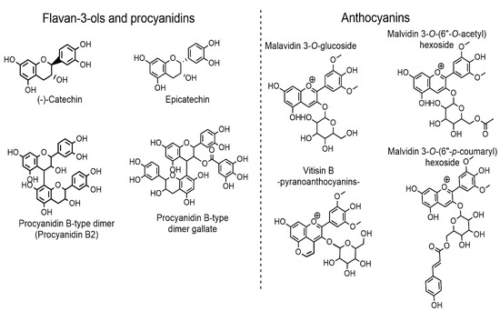 Structural formulas of main flavan-3-ols, procyanidins, and anthocyanins/pyroanthocyanin confirmed in young and/or aged Prokupac wines by untargeted analysis.