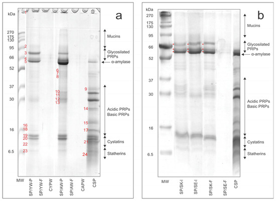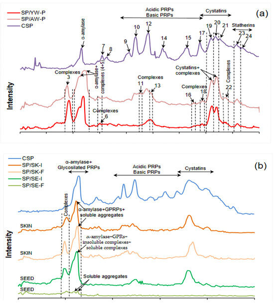Electrophoregrams of: (a) salivary proteins (CSP) and precipitates after interaction with young and aged wines (SP/YW-P and SP/AW-P); (b) salivary proteins (CSP), CSP/seed and CSP/skin fractions after incubation (SP/SE-I and SP/SK-I), and CSP/seed and CSP/skin filtrates (SP/SE-F and SP/SK-F). Abbreviations are also explained in Section 2.4; PRPs—proline-rich proteins. The numbers mark peaks (Figure 3a) in accordance with the numbers marked in Figure 2a.