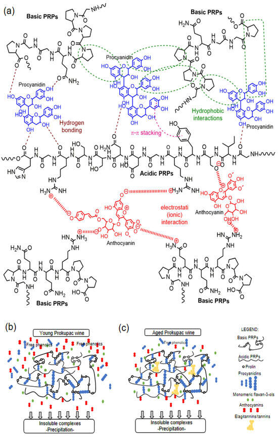 A schematic representation of: (a) interactions between proline-rich proteins and procyanidins/anthocyanins; (b) formation of insoluble complexes between PRPs and phenolic compounds in young wine; and (c) formation of insoluble complexes between PRPs and phenolic compounds in aged wine.