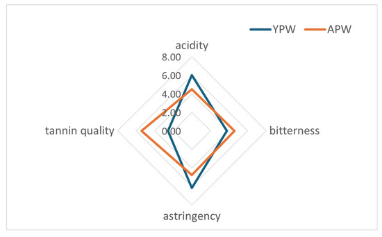 The results of the sensory analysis are summarized in Figure 5, which visually highlights the perceptual differences between young and aged Prokupac wines. Aged wine was characterized by higher scores in tannin quality, while young wine showed greater acidity and astringency. Bitterness appeared comparable between the two samples. These sensory trends were further supported by statistical analysis (Table S4). Statistically significant differences between young and aged Prokupac wines were indicated for the parameters acidity, astringency, and tannin quality, while the p-value for bitterness showed no significant differences. The sensorial analysis of the young and aged Prokupac wines revealed differences between the wines, but not between the panelists involved in the study.