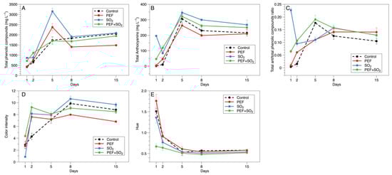 - López-Giral, N.; López, R.; Santamaría, P.; González-Arenzana, L.; Garde-Cerdán, T. Phenolic and Colour Characteristics of Must and Wine Obtained from Red Grapes Treated by Pulsed Electric Fields. Efficacy of PEF to Reduce Maceration Time in Elaboration of Red Wines. Eur. Food Res. Technol. 2023, 249, 273–282. [Google Scholar] [CrossRef]