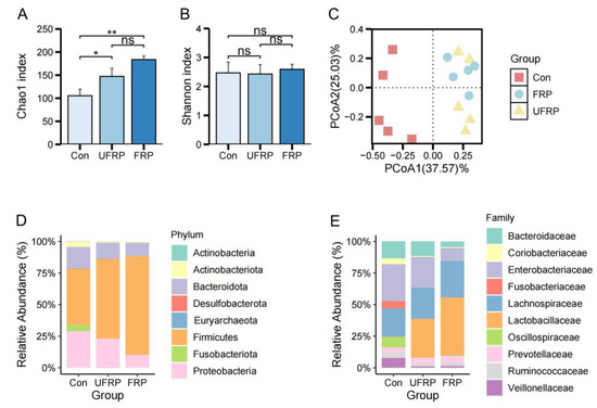 (A) Chao1 index and (B) Shannon index for Con, UFRP, and FRP. (C) Principal coordinate analysis (PCoA) of microbial community structures including Con, FRP, and UFRP. Relative abundance based on ASV at the (D) phylum level and (E) family level in Con, UFRP, and FRP. Data are presented as mean ± SD. Statistical significance is indicated as: ns, not significant; * p < 0.05, ** p < 0.01. (n = 5/group).