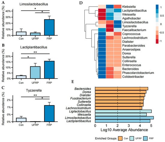 Relative abundance at the genus-level for Con, UFRP, and FRP: (A) Limosilactobacillus, (B) Lactiplanbacillus, and (C) Tyzzerella. (D) Relative genus abundance in Con, UFRP, and FRP. (E) LDA with effect size measurements showing enriched genus in Con, UFRP, and FRP fecal samples. Data are presented as mean ± SD. Statistical significance is indicated as * p < 0.05, ** p < 0.01. (n = 5/group).