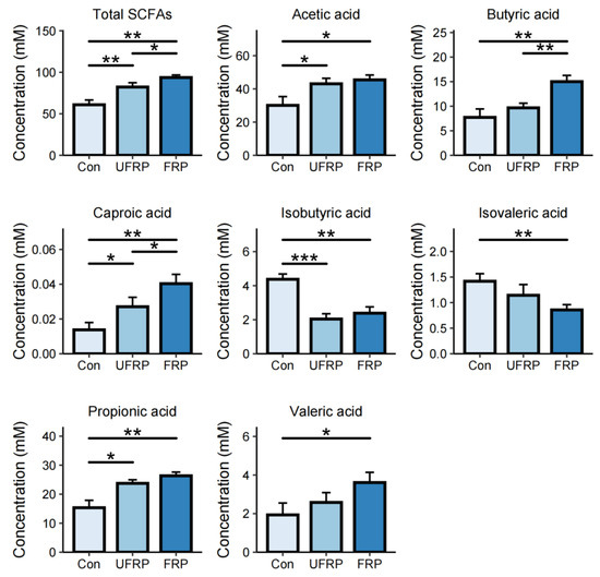 Effects of different treatments on the concentration of short-chain fatty acids (SCFAs). The figure presents the concentration of total SCFAs and individual SCFAs (acetic acid, propionic acid, butyric acid, isobutyric acid, valeric acid, isovaleric acid, and caproic acid) in Con, UFRP, and FRP. Data are presented as mean ± SD. Statistical significance is indicated as * p <0.05, ** p < 0.01, and *** p < 0.001. (n = 5/group).