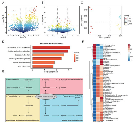 Volcano maps of differential metabolites comparing (A) Con and FRP; (B) UFRP and FPRP. (C) Principal components analysis (PCA) of metabolite structures including Con, FRP, and UFRP. (D) KEGG functional pathway of gut microbiota metabolites. (E) Metabolic pathway of key compounds. (F) Relative metabolite abundance in Con, UFRP, and FRP.