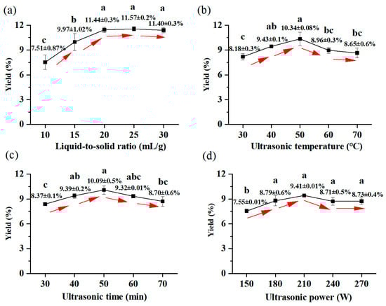 The effect of liquid-to-solid ratio on GSP yield: (a) ultrasonic temperature, (b) ultrasonic time, (c) ultrasonic power. (d) The direction of the arrow indicates the direction of the trend. Distinct superscript letters (a–c) within columns denote statistical significance (p < 0.05).
