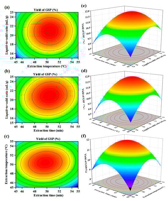 The 2D contour plots (a–c) and 3D response surface plots (d–f) of GSPs. The redder the color, the higher the yield.