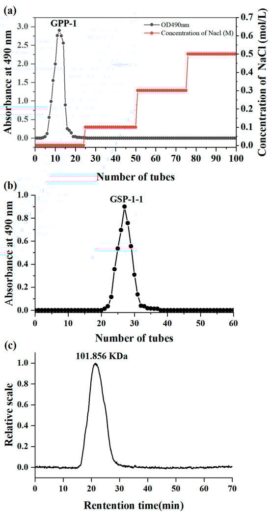 Elution curve of crude GSPs on DEAE-52 cellulose chromatography column, (a). Elution curve of crude GSP-1 on cellulose chromatography column, (b). Molecular weight results for GSP-1-1, (c).
