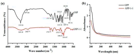 FT-IR spectra of GSPs (a) and UV spectroscopy of GSPs (b).