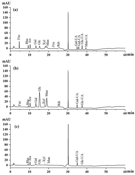 The monosaccharide profiling of GSPs was adapted from a method reported in the literature and slightly modified [26,27]. Briefly, 20 mg of powder was hydrolyzed in 1 mL of TFA (2.0 M) at 121 °C for 2 h in a sealed glass tube, which was purged with nitrogen gas and blow-dried. We added 99.99% methanol for cleaning, and then blow-dried the sample again. We repeated the methanol cleaning process 2 to 3 times. The sample was reconstituted in sterile water and analyzed via ion chromatography (Thermo ICS 5000+, Thermo Fisher Scientific, Waltham, MA, USA), equipped with electrochemical detection. For chromatographic separation, we utilized a Dionex CarboPac PA20 (Thermo Fisher Scientific, Waltham, MA, USA) column with a ternary mobile phase: H₂O (A), 0.1 M NaOH (B), and a mixture of 0.1 M NaOH/0.2 M NaAc (C). These were delivered at a flow rate of 0.5 mL/min at 30 °C, with an injection volume of 5 μL. The gradient elution was performed according to the schedule below: at 0 min (95:5:0, A/B/C, v/v); at 26 min (85:5:10); at 42 min (85:5:10); at 42.1 min (60:0:40); at 52 min (60:40:0); at 52.1 min (95:5:0). This composition was then held constant until 60 min. The analysis involved thirteen reference standards, with chromatographic conditions identical to those described in the preceding section. Data were acquired on an ICS5000+ (Thermo Fisher Scientific, Waltham, MA, USA) and processed using chromeleon 7.2 CDS (Thermo Fisher Scientific, Waltham, MA, USA).