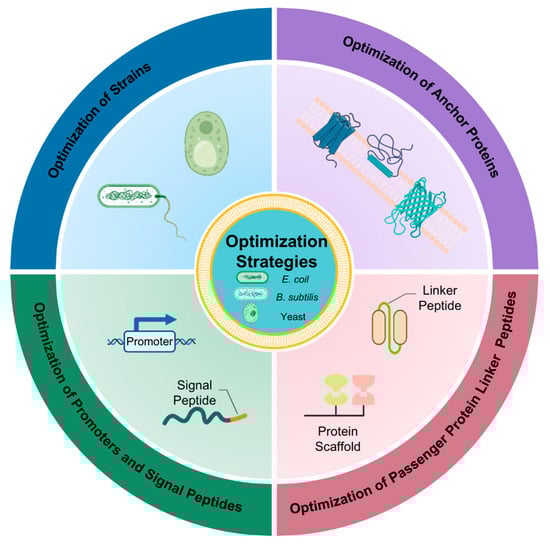 | Optimization Strategies | Strains | Anchor Proteins | Optimization Methods | Results | References |
