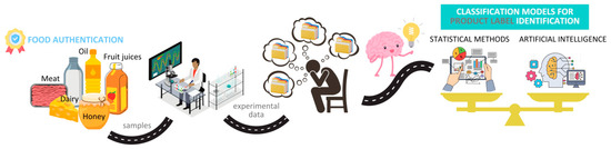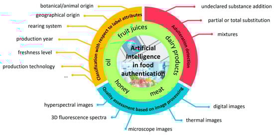The initial use of AI for the development of authentication tools went hand in hand with advanced supervised statistical strategies, as they were used as an alternative to the latest or for validation purposes. This is because, in this early stage, AI was especially applied for the development of classification models for food differentiation with respect to several label attributes, like the geographical origin, botanical source, animal species, or production year. It was proven through several studies that the application of either advanced statistical methods or AI resulted in the achievement of comparable recognition models in terms of accuracy [4,5]. Afterwards, the potential of AI for food fraud detection— even for common frauds, like the addition of sugar in fruit juices [6], or for ones that are very subtle and difficult to detect, as is the case of partial substitution of a food variety with a cheap one, like undeclared oil or honey mixtures [7,8,9]—was recognized and transformed through effective tools. During the last few years, a step forward was made through employment of the enhanced capabilities of AI to interconnect the provided data and to construct recognition models based on images, with these provided data recorded through analytical procedures or derived from visual files [10,11].