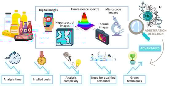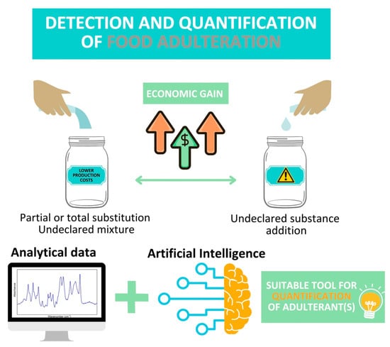 Because of the significant natural variability of food commodities and also the insertion on the market of products that have passed many times through a subtle and hard-to-detect adulteration process, the development of reliable strategies for counterfeit detection represents a challenge and involves a huge amount of data impossible to handle by human processing capabilities alone. For this reason, the involvement of supervised statistical tools and, more recently, artificial intelligence (AI) for the development of reliable instruments for the detection of sophisticated adulterations has become an important strategy. The increased demand for the application of the above-mentioned data processing strategies is in strong connection with the new tendency regarding the application of rapid and green analytical methods, as they are simultaneously encouraged by the development of portable market equipment [1]. Moreover, during recent years, the enhanced capabilities of AI to extract subtle and meaningful information from a huge amount of data and to generate well-grounded assessments has transcended limits with the development of reliable tools for food quality and authenticity verdicts based on digital images, hyperspectral data, thermographic images, etc. [2,3].