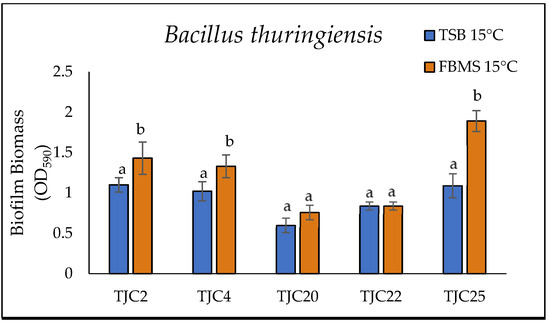 Figure 4 illustrates the ability of the strains investigated in this study to develop biofilms on polystyrene surfaces using TSB and FBMS as growth media at a temperature of 15 °C. All strains demonstrated biofilm-forming ability (absorbance at 590 nm ≥ 1 in crystal violet assays), although with different biofilm patterns. Notably, biofilm production was consistently higher in FBMS than in TSB. While a significant proportion (11/15 strains) were classified as weak biofilm producers in TSB, B. thuringensis TJC2, and TJC25, B. oceanisediminis TJC1, and S. enterica subsp. salamae TCJ3 exhibited moderate biofilm formation. Conversely, FBMS significantly enhanced biofilm development across most strains, with only 8 of 15 remaining weak producers. Strikingly, B. thuringensis TJC25, produced the highest biomass, being classified as a moderate biofilm producer. These observed differences in biofilm formation and phenotypic resistance patterns likely reflect the profound genomic differences between strains as observed previously by Fagerlund et al. [58]. Divergent opinions still exist on the relationship between nutrient availability and the development of biofilms. Some research has found that biofilm formation is decreased under nutrient deprivation, while other studies have suggested the opposite [59]. Additionally, particles of foods may promote the initial bacterial attachment to inert surfaces, promoting biofilm formation [60].