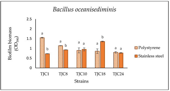 It is well known that surface properties significantly influence biofilm formation. In the food industry, SS is widely used due to its high mechanical strength, easy cleaning, and compatibility with process equipment. Our results (Figure 5) demonstrated that the SS surface supports the biofilm formation of the different strains with a strain-dependent effect. Notably, B. oceanisediminis TJC18, S. enterica subsp. salamae TJC 19 and B. thuringensis TJC2 exhibited higher biofilm biomass on SS compared to PS surfaces, whereas B. oceanisediminis TJC1, B. thuringensis TJC4, and TJC 25 were the weak producers.