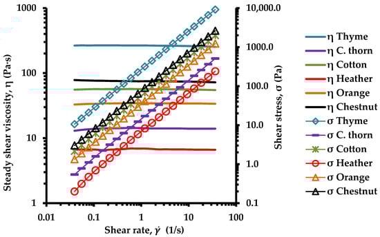 All liquified honey samples exhibited Newtonian behavior, based on the apparent viscosity (η) values which were independent of shear rate (), and the shear stress (σ) linearly varied with the shear rate, on a log–log scale (Figure 1). Many previous researchers have also noticed Newtonian behavior for liquid honeys [62,63]. Thyme honey exhibited high viscosity (η) values, while the heather honey samples displayed low viscosity (Figure 1 and Figure 2). These differences are likely attributable to the distinct botanical origin of the honey samples which can lead to compositional differences; previous studies have suggested that small variations in the water content and sugar composition of honey can influence these rheological properties [64,65,66].