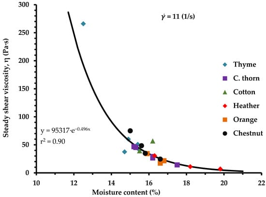 Accordingly, heather honey, which had the highest moisture content of the tested samples, exhibited the lowest viscosity, whereas thyme honey, exhibited the lowest moisture content (Table 1) and a high sugar content level (Table 3), and displayed the highest viscosity (Figure 1 and Figure 2). Therefore, a strong relationship was found between the steady shear viscosity, η, and moisture content of the honey samples, implying that the decrease in moisture content results in an exponential increase of honey viscosity (Figure 2), as has been suggested by previous studies as well [66,67,68].