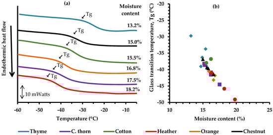 Representative thermal scans of Greek monofloral honey samples with different moisture content (a) and effect of moisture content on glass transition temperature (Tg) (b); the Tg values were estimated by differential scanning calorimetry from the onset of heat flow drop in the second thermal scan (10 °C/min heating rate).