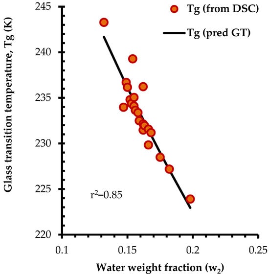 The inverse relationship between moisture content and Tg, as illustrated in Figure 3b, reveals the strong plasticization effect of water on honey solids. Regardless of botanical origin, the honey samples followed the same trend, with higher moisture content resulting in lower Tg values. This effect is explained by the presence of hydrophilic compounds (sugars exhibiting compatibility with water upon hydration), of small molecular weight (sugars), and increased free volume, all of which enhance hygroscopicity and lead to lower Tg values [73]. To further explore the relationship between moisture and Tg of the liquid honeys, the experimental data were fitted to the Gordon–Taylor (GT) equation (Figure 4). The data fitting was reasonably good (r2 = 0.85) and the estimated values of k and Tg1 from the GT model were 3.41 and 24.05 °C (predicted Tg value of dry honey), which are in close agreement with previous findings [66].