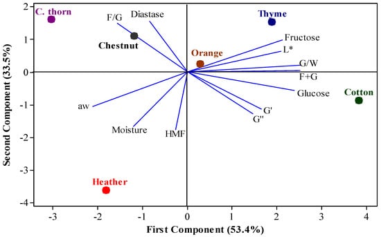 Moisture content, aw, diastase activity, HMF content, G′ and G″ moduli (at 1 Hz), L* color parameter, fructose and glucose content and fructose/glucose (F/G), fructose+glucose (F + G) and glucose/water (G/W) values were interrelated using Principal Component Analysis (PCA) by employing the Minitab version 18 software (Minitab, Inc., State College, PA, USA).