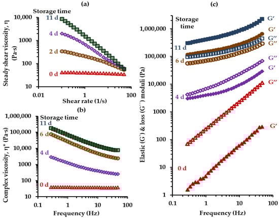 To assess the flow behavior of the honey samples, steady shear viscosity (η) and shear stress (σ) were measured over a range of shear rates () of 0.01–200 s−1 at 20 °C. Moreover, oscillatory measurements were conducted to determine the storage (G′) and loss (G″) moduli, as well as the complex viscosity (η*), over a range of angular frequencies (ω) of 0.1–100 Hz at 20 °C and 0.1% strain. For the study of creaming process kinetics, the rheological testing of honey samples was performed every two days over a 27-day period.