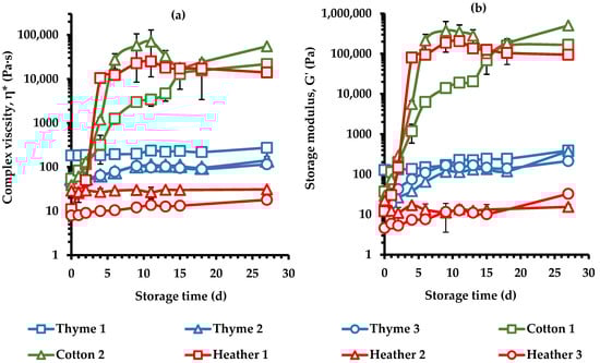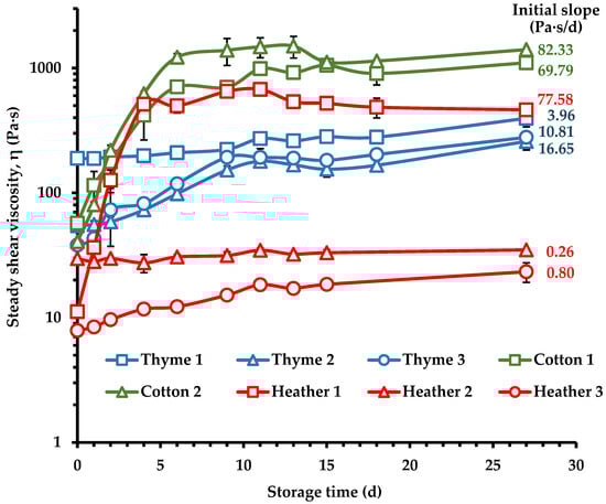 Regarding the coefficient of consistency (K values, Table 4) derived from the power-law fitting, there was an increase in all tested samples after 27 days of storage, also signaling the development of crystallization. At the end of storage period, the K value was highest for Cotton 2, followed by the Cotton 1, Heather 1, Thyme honeys, and Heather 2 and Heather 3 samples. This suggests that cotton honeys tend to crystallize to a higher extent than the other samples tested, which is also consistent with their highest η values at the end of the creaming process (Figure 7).