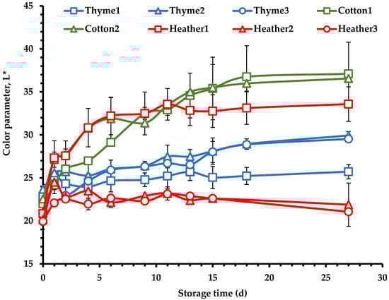 Colorimetric measurements also showed increases in the L* color parameter upon honey crystallization (Figure 9). After 13 days of storage, a plateau was reached, as has been also reported by other authors [13,79]. The color parameters of creamed honeys may be influenced by the size and shape of the formed crystals [80], where the increased L* values are likely due to light reflection from the formed glucose crystals [13]. Furthermore, increased L* values may be linked to the rate and extent of crystallization, as samples with higher glucose content and certain favoring crystallization indices (F/G, G/W) tend to crystallize more quickly. The colorimetric measurements also showed that cotton honey samples exhibited the highest L* values, followed by heather 1, thyme samples, and finally heather 2 and heather 3 (Figure 9), consistent with the compositional data of these samples (Table 3) and in agreement with the findings from the rheological responses of the stored honeys throughout the creaming process (Figure 7 and Figure 8).