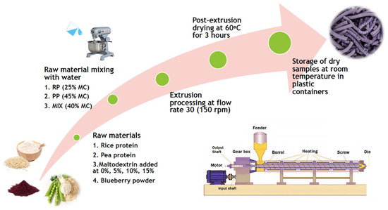 Following extrusion cooking, the extruded samples were collected and dried for 3 h using a cross-flow hot air dryer functioning at 60 °C to reduce moisture content and reach a lower moisture content to prevent mold growth during storage. Dry samples were stored in airtight plastic containers at room temperature and used for analysis [25]. Methodology used is schematically shown in Figure 1.