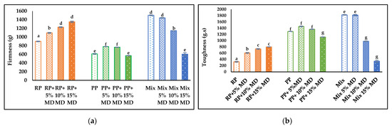 Texture analysis showing (a) firmness (g); (b) toughness (g.s) of RP, PP, and Mix samples after extrusion without MD and with 5%, 10%, and 15% MD. Different lowercase letters indicate a significant difference among samples (p < 0.05).