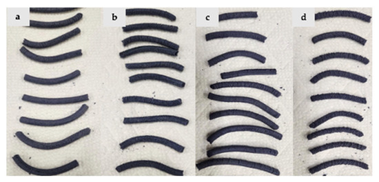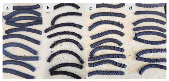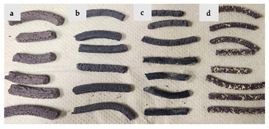 Appearance of (a) RP samples with no added MD; (b) RP samples with 5% MD; (c) RP samples with 10% MD; (d) RP samples with 15% MD.