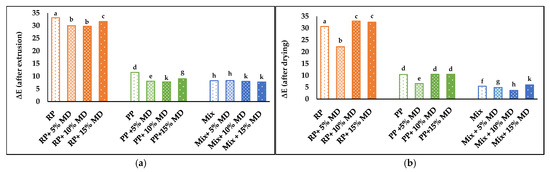 Color difference (∆E) (a) after extrusion; (b) after air drying of RP, PP, and Mix samples without MD and with 5, 10, and 15% MD. Different lowercase letters indicate a significant difference among samples (p < 0.05).