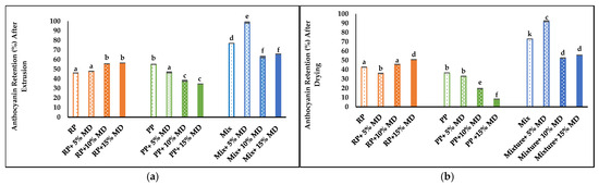 Anthocyanin retention after extrusion is shown in (Figure 7a), with the highest retention in Mix samples. Moreover, anthocyanin retention decreased in all RP, PP, and Mix samples after drying, with the highest retention also observed in Mix samples (Figure 7b). The increased moisture content used in PP and Mix samples caused an increase in anthocyanin retention in comparison with RP samples. Moreover, added MD enhanced the entrapment and retention of anthocyanin. However, in PP samples, low anthocyanin retention was observed after extrusion and drying due to texture deterioration (Figure 7a,b).