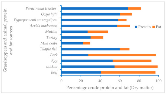 Comparison of the crude protein and fat values of grasshoppers Paracinema tricolor, Oxya hyla, Eyprepocnemis smaragdipes, and Acrida madecassa and selected conventional protein sources eaten in Madagascar. The protein and fat data for the conventional sources were obtained from the USDA (United States Department of Agriculture) [40].