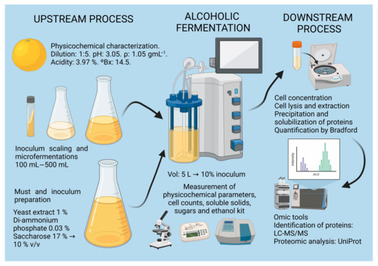 Passion fruit wine proteomics workflow. The upstream process includes the physicochemical characterization of the fruit, the scaling of the inoculum, and the preparation of the must; alcoholic fermentation refers to the production of wine within the bioreactor, and the downstream process refers to the proteomics of the final product. Created with BioRender.com (https://www.biorender.com).