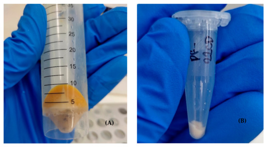 Pellets were resuspended in 600 µL of cold sterile distilled water and the homogenate was transferred to microtubes and centrifuged twice at 16,900× g for 30 s at 4 °C (Eppendorf, 5418 R, Hamburg, Germany). Finally, the pellet was resuspended in 600 µL of Phosphate Buffered Saline (PBS), the supernatant was discarded, and the cell concentrate was stored at −80 °C until further processing, see Figure 2B.