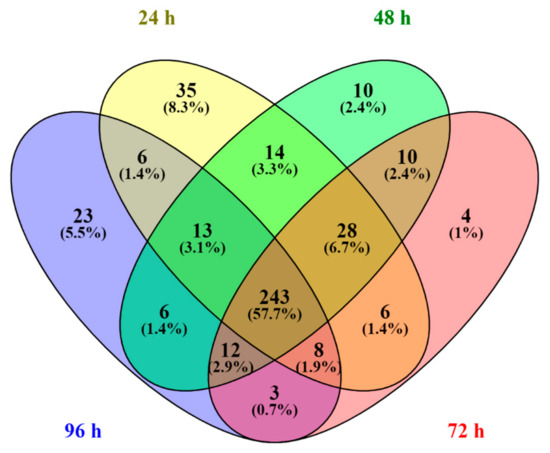 Venn diagram showing the number of common and specific proteins found at each sampling point of alcoholic fermentation (24, 48, 72, and 96 h). Values in brackets indicate the proportion of the total number of common proteins (421) of Saccharomyces cerevisiae E1 (ATCC: MYC-425).