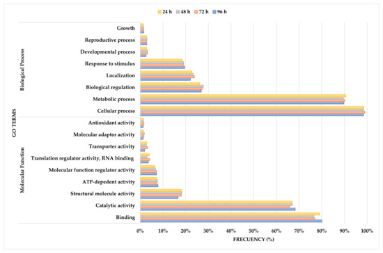 GO term enrichment analysis of the proteins found at each sampling time (24, 48, 72, and 96 h), represented as the frequency (%) of proteins associated with each GO Term at the second hierarchical level within the “biological process” and “molecular function” domains.